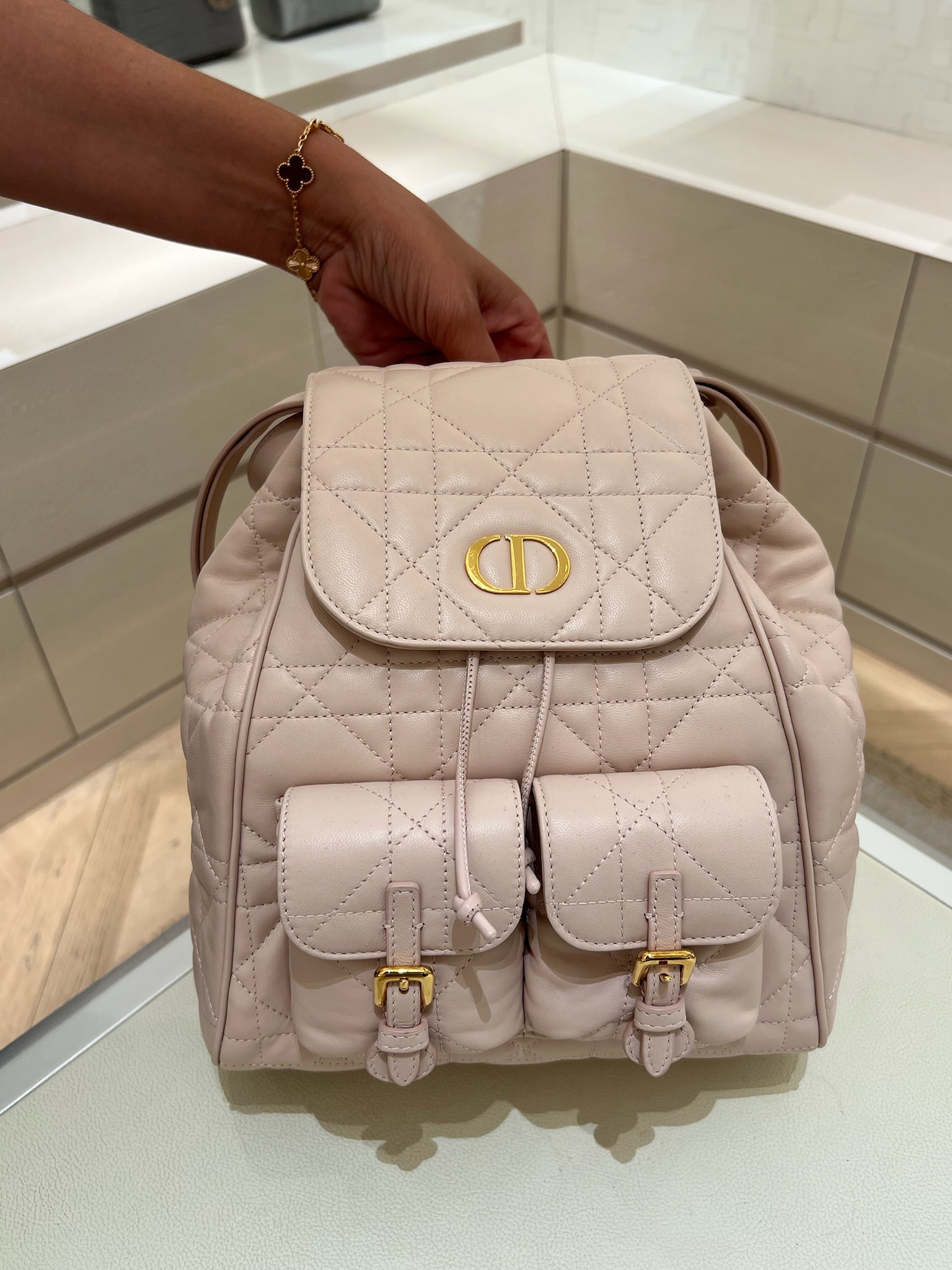 Uma mochila que mistura funcionalidade com luxo, consegue unir o uso diário com estética Dior refinada. Disponível em couro preto, nude e off-white.