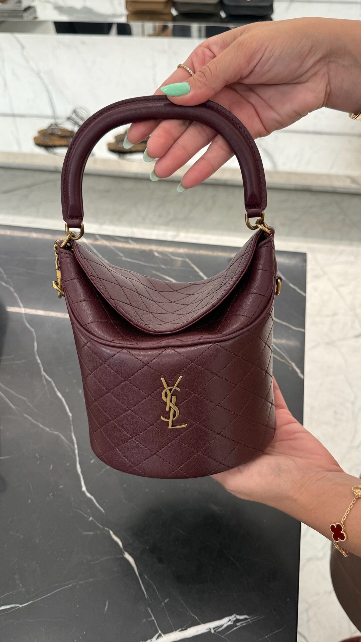 Essa bolsa é um mix de elegância e utilidade. O quilting + o logo dão um toque de luxo clássico, a estrutura “bucket” torna a bolsa casual/chique e versátil. Disponível em couro preto, verde e bordô.