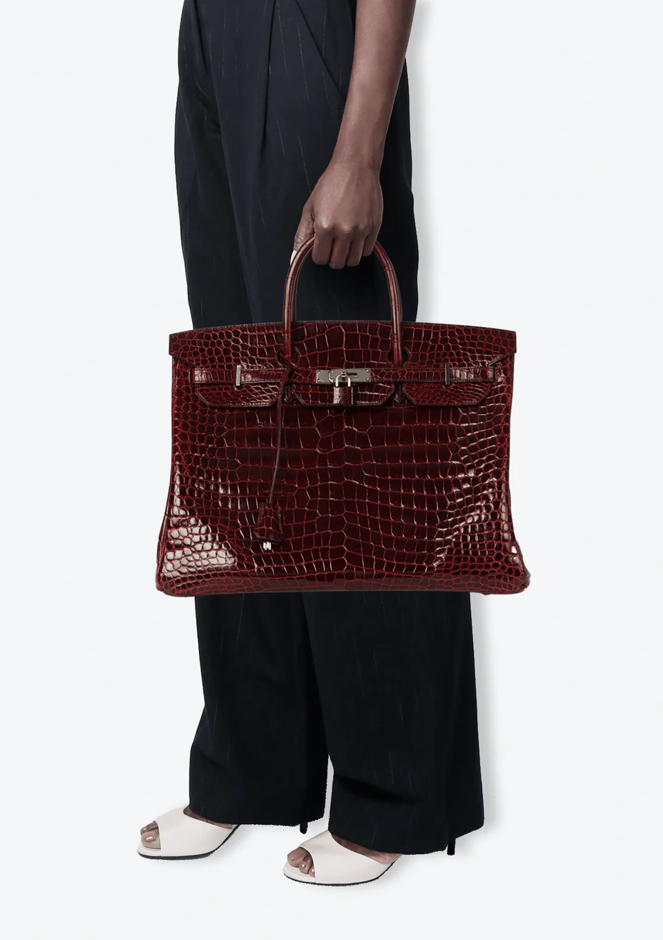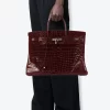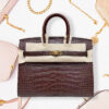 Bolsa Birkin 30 em couro crocodilo brilhante marrom, ferragens douradas. Luxo clássico e atemporal.