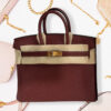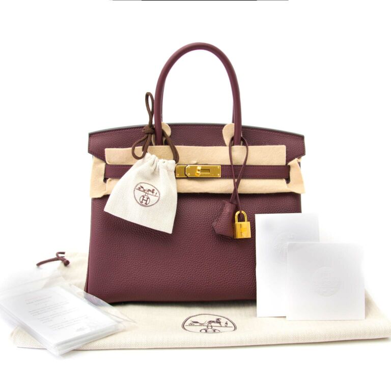 Bolsa Birkin 30 em couro Togo bordeaux, ferragens douradas. Elegância com toque sóbrio.