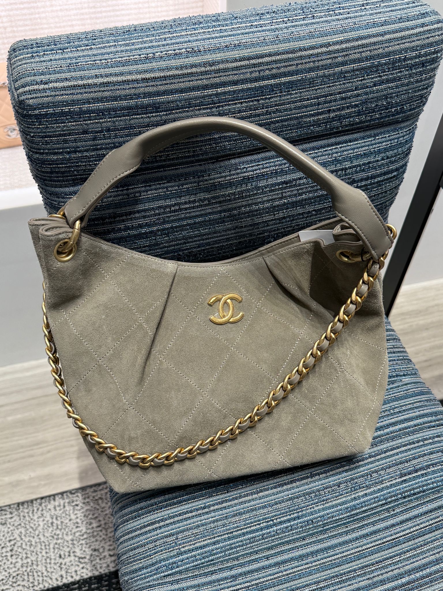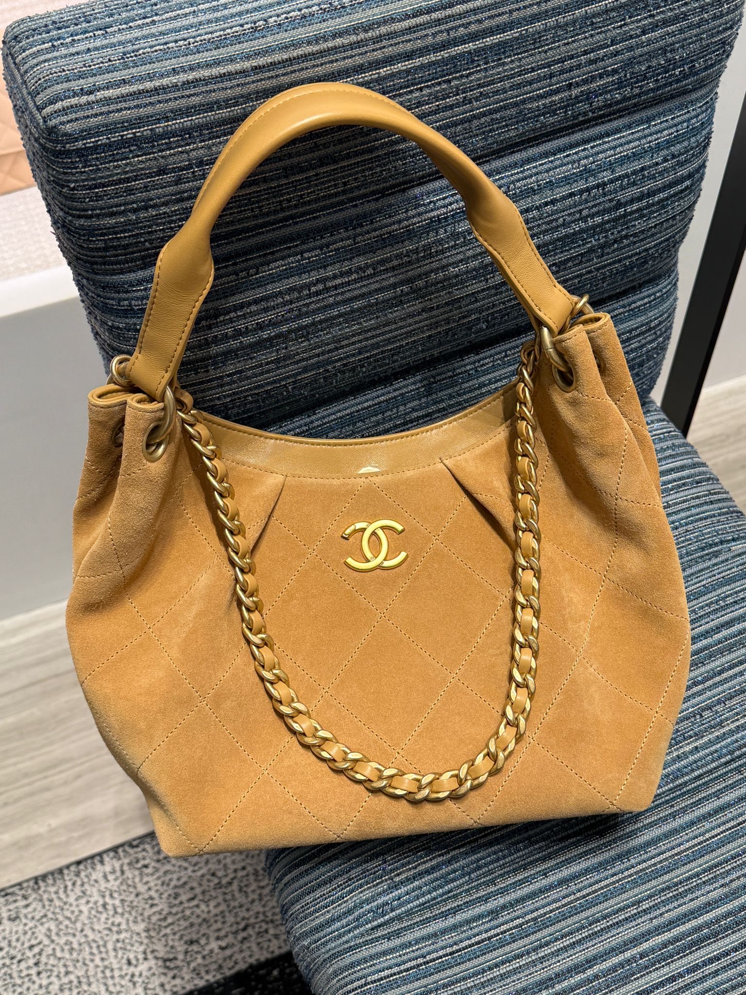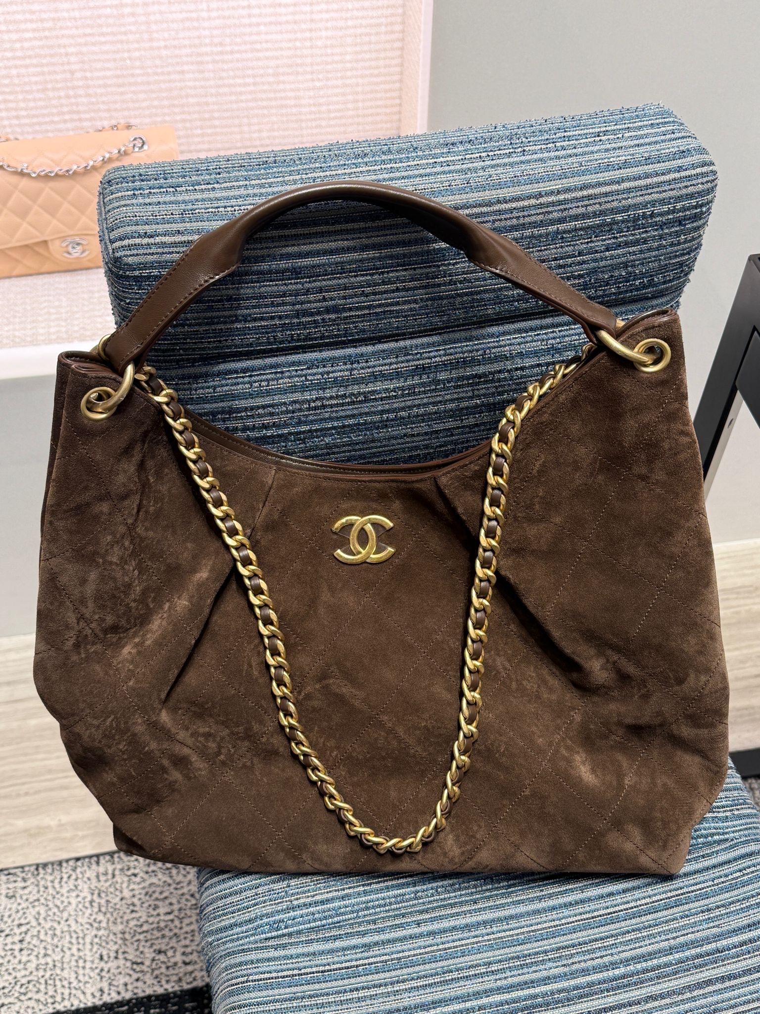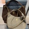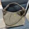 Estilo Hobo com formato mais despojado, feita em couro ou camurça com alça de corrente entrelaçada em couro.